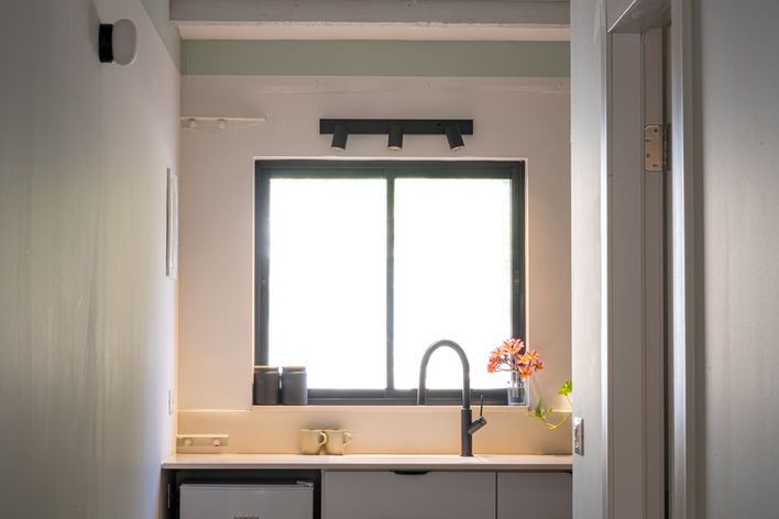מתחם חדרים רב שימושי עם תקרה גבוהה קיימת עם קורות עץהדרישה הייתה לייצר 2 חדרי טיפול מתחלפים עם פינת המתנה